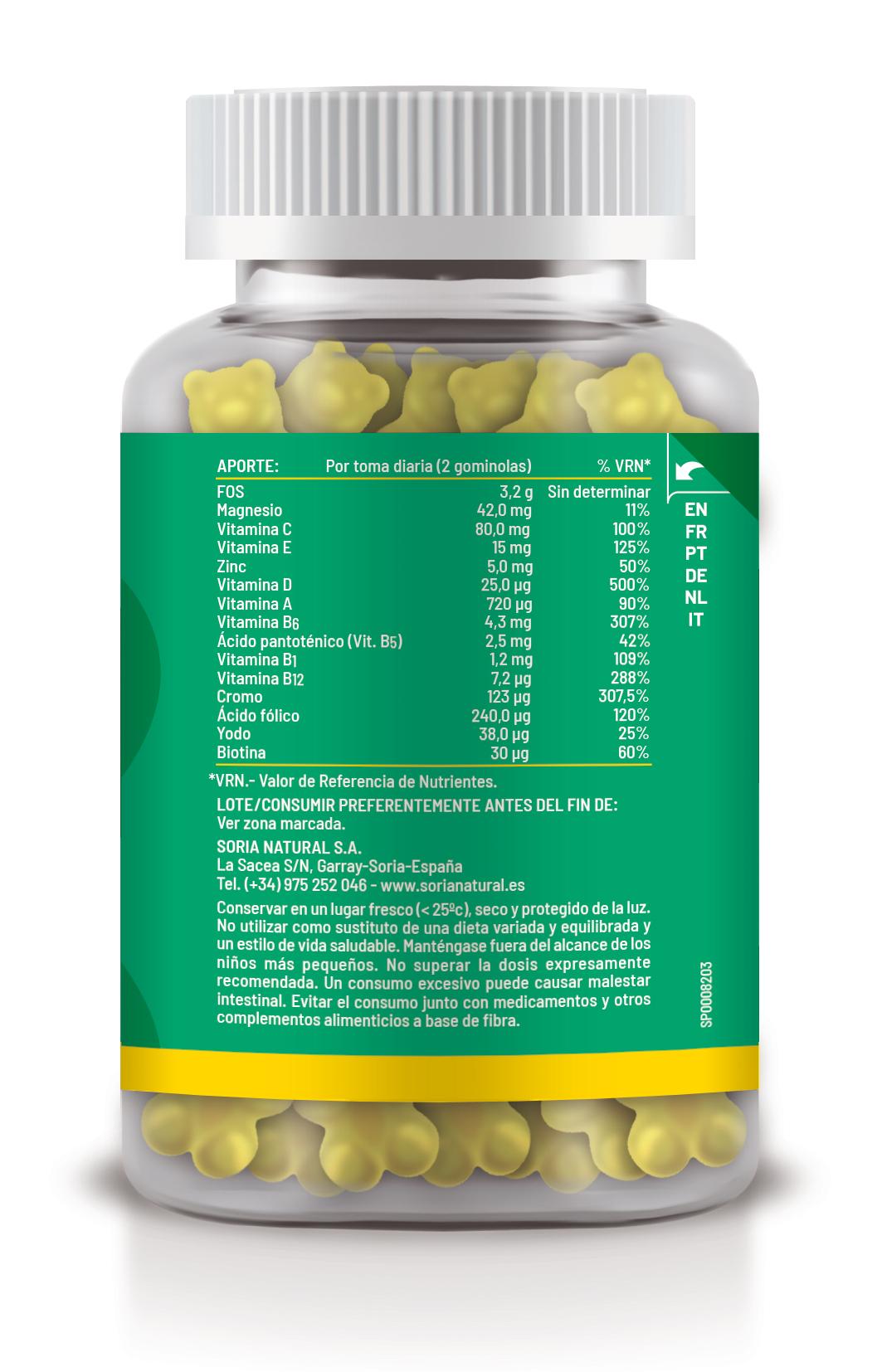 La fórmula de Multivit gominolas Soria Natural incluye FOS, vitaminas y minerales seleccionados para un uso diario. Por la toma de 2 gominolas aporta 3,2 g de FOS, 42 mg de magnesio, 80 mg de vitamina C, 15 mg de vitamina E, 5 mg de zinc, 25 microgramos de vitamina D, 720 microgramos de vitamina A, 4,3 mg de vitamina B6, 2,5 mg de vitamina B5, 1,2 mg de vitamina B1, 7,2 microgramos de vitamina B12, 123 microgramos de cromo, 240 microgramos de ácido fólico, 38 microgramos de yodo y 30 microgramos de biotina. Esta combinación le da un perfil bastante completo dentro de los multivitamínicos en gominola.