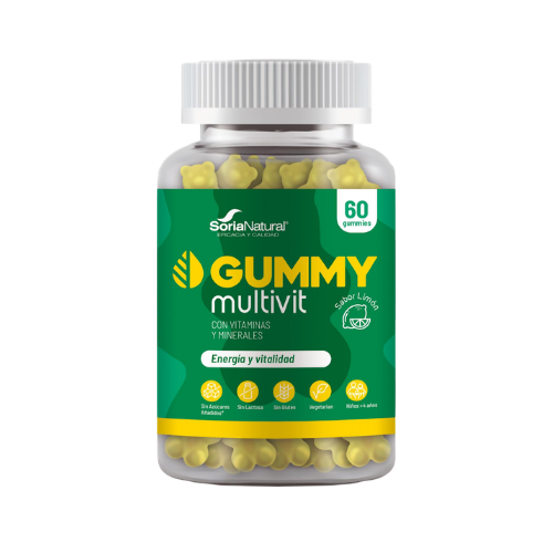 Multivit gominolas Soria Natural es un complemento alimenticio en formato gominola pensado para aportar vitaminas y minerales en una pauta diaria sencilla. Se presenta en bote con 60 gominolas, sabor limón, y la marca lo sitúa dentro de su línea de energía y vitalidad. Además, se comercializa como una opción sin azúcares añadidos, sin gluten, sin lactosa y apta para niños mayores de 4 años.