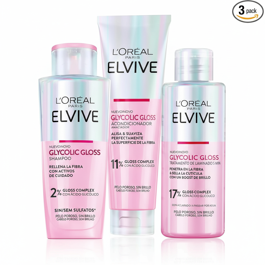 El Pack Elvive Glycolic Gloss de L’Oréal Paris está pensado para devolver al pelo ese acabado de brillo espejo que se pierde con el daño, la porosidad, el calor o los lavados. Su fórmula con ácido glicólico ayuda a suavizar y sellar la cutícula, para que el cabello refleje mejor la luz y se note más uniforme al tacto.