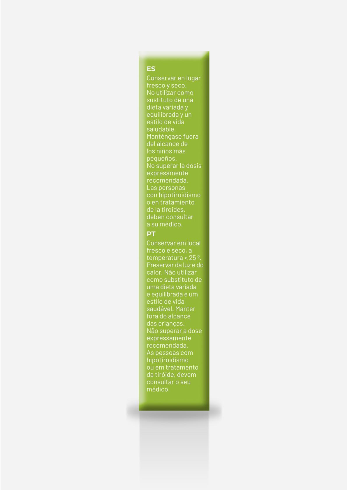| Advertencias | Las personas con hipotiroidismo o en tratamiento de la tiroides deben consultar a su médico. No superar la dosis recomendada. No utilizar como sustituto de una dieta variada y equilibrada y un estilo de vida saludable. Mantener fuera del alcance de los niños más pequeños. |