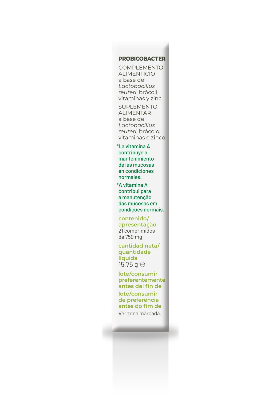 Probicobacter comprimidos es un complemento alimenticio en comprimidos formulado con Lactobacillus reuteri Pylopass, extracto seco de brócoli, zinc y vitaminas A, C y B12. Se presenta en caja con 21 comprimidos de 750 mg y está pensado para un uso práctico de una toma al día. La fórmula se orienta al mantenimiento de las mucosas en condiciones normales, dentro del marco propio de un complemento alimenticio, y la marca lo identifica además como un producto sin gluten.