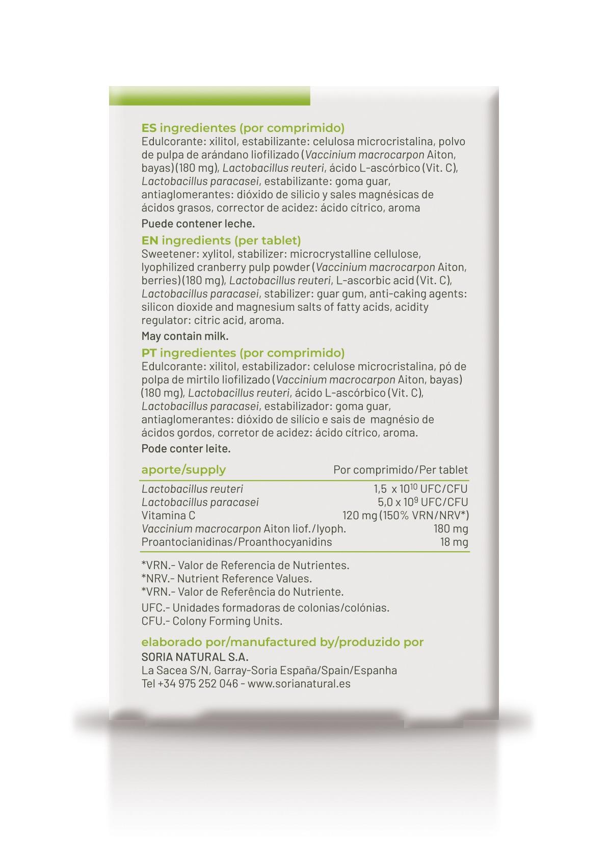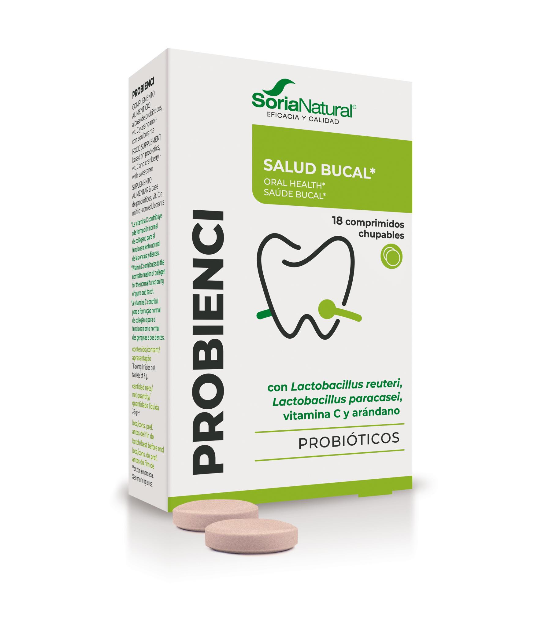 Probienci comprimidos 18 x 2 g de Soria Natural combinan Lactobacillus reuteri y Lactobacillus paracasei con vitamina C y polvo de pulpa de arándano rojo liofilizado. Por comprimido aporta 1,50 x 10^10 UFC de Lactobacillus reuteri, 5,0 x 10^9 UFC de Lactobacillus paracasei, 120 mg de vitamina C, 180 mg de Vaccinium macrocarpon Aiton liofilizado y 18 mg de proantocianidinas. Entre sus ingredientes figuran también xilitol, celulosa microcristalina, goma guar, dióxido de silicio, sales magnésicas de ácidos grasos, ácido cítrico y aroma. La marca indica además que puede contener leche.