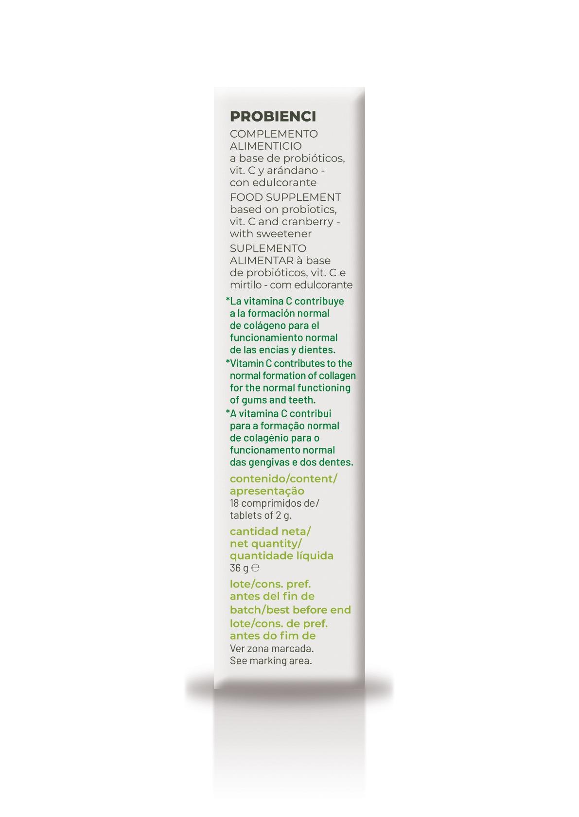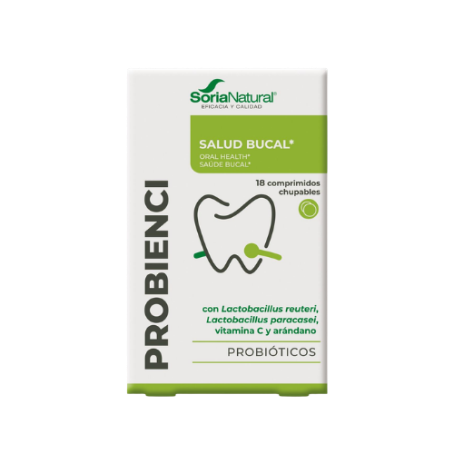 Probienci comprimidos 18 x 2 g de Soria Natural es un complemento alimenticio en comprimidos para chupar, formulado con dos cepas probióticas, vitamina C y arándano rojo liofilizado. Se presenta en caja con 18 comprimidos de 2 g, está orientado al cuidado bucal y la marca lo identifica como un producto sin gluten.