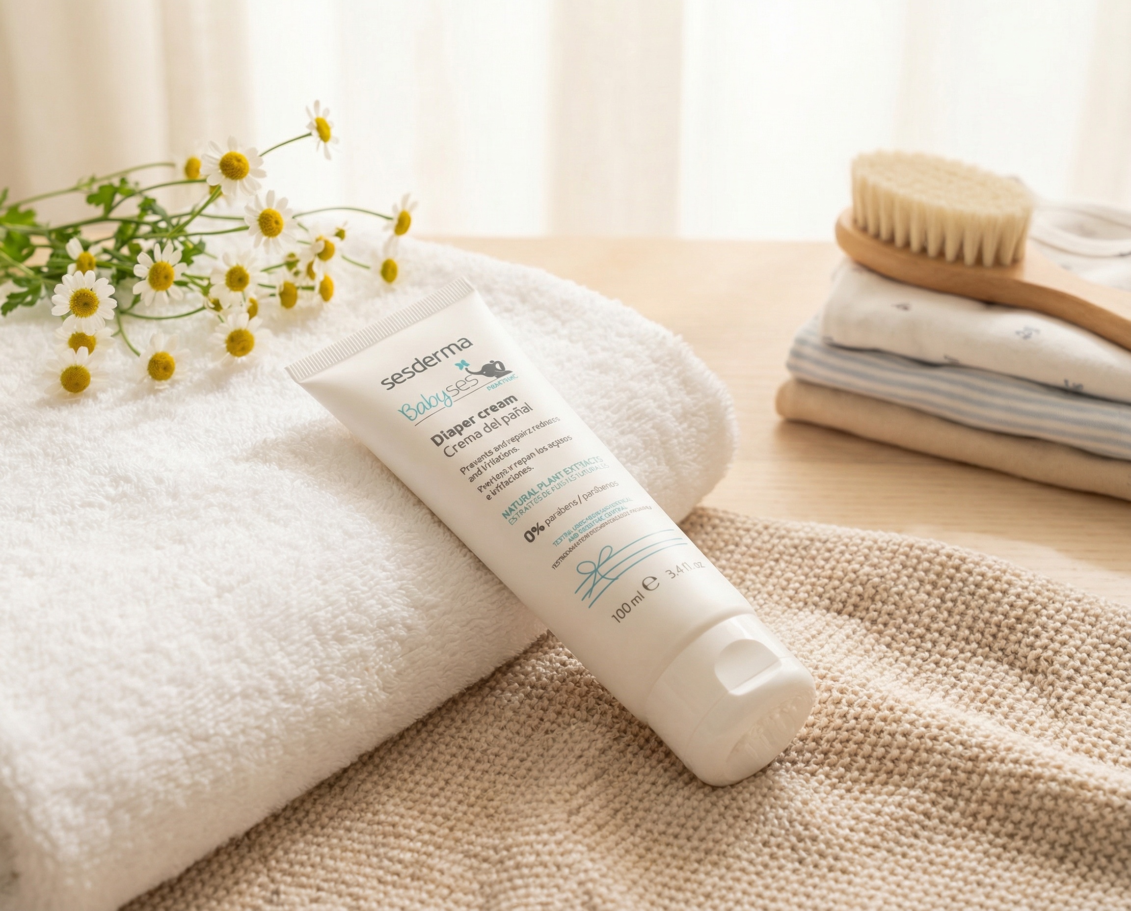 La fórmula combina varios ingredientes clave que ayudan a entender por qué esta crema tiene buena acogida dentro de la categoría de cuidado del culito del bebé. Sesderma destaca la presencia de óxido de zinc, dióxido de titanio, fosfolípidos y pantenol. Según la información oficial, el óxido de zinc y el dióxido de titanio actúan formando una barrera protectora frente a agentes externos y humedad, mientras que los fosfolípidos y el pantenol ayudan a la regeneración de la piel, evitan la deshidratación y calman la sensación de malestar. Además, en el listado INCI aparecen otros ingredientes conocidos dentro de la cosmética de cuidado como glicerina, alantoína, extracto de camomila, extracto de caléndula, escualeno y ceramida NP. En conjunto, la fórmula está planteada para responder a una necesidad muy concreta y frecuente: proteger una piel especialmente delicada y mantenerla más confortable durante una etapa en la que el pañal forma parte constante de la rutina.