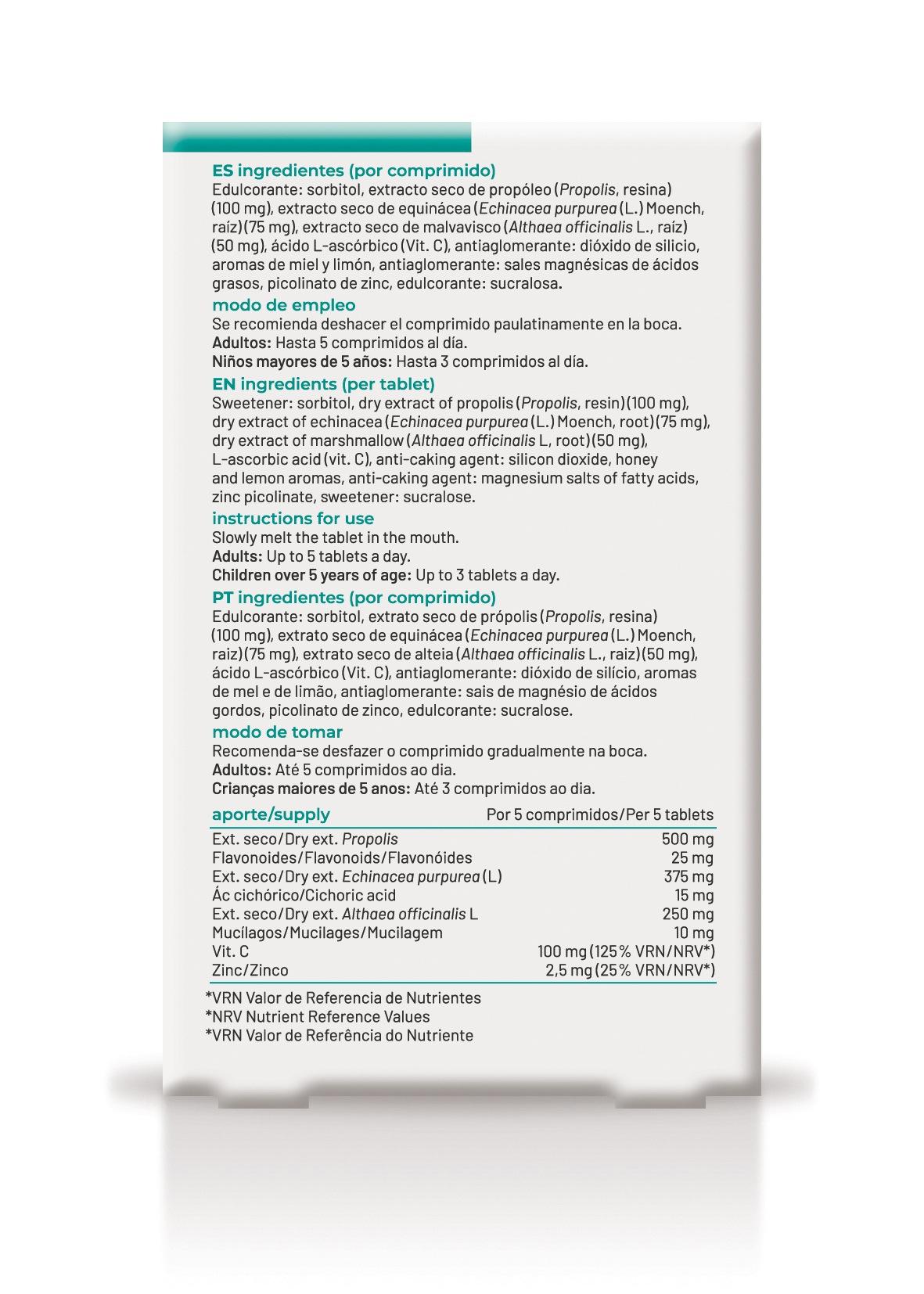 | ngredientes principales por comprimido | propóleo 100 mg, equinácea 75 mg, malvavisco 50 mg, vitamina C 100 mg y zinc 2,5 mg. |