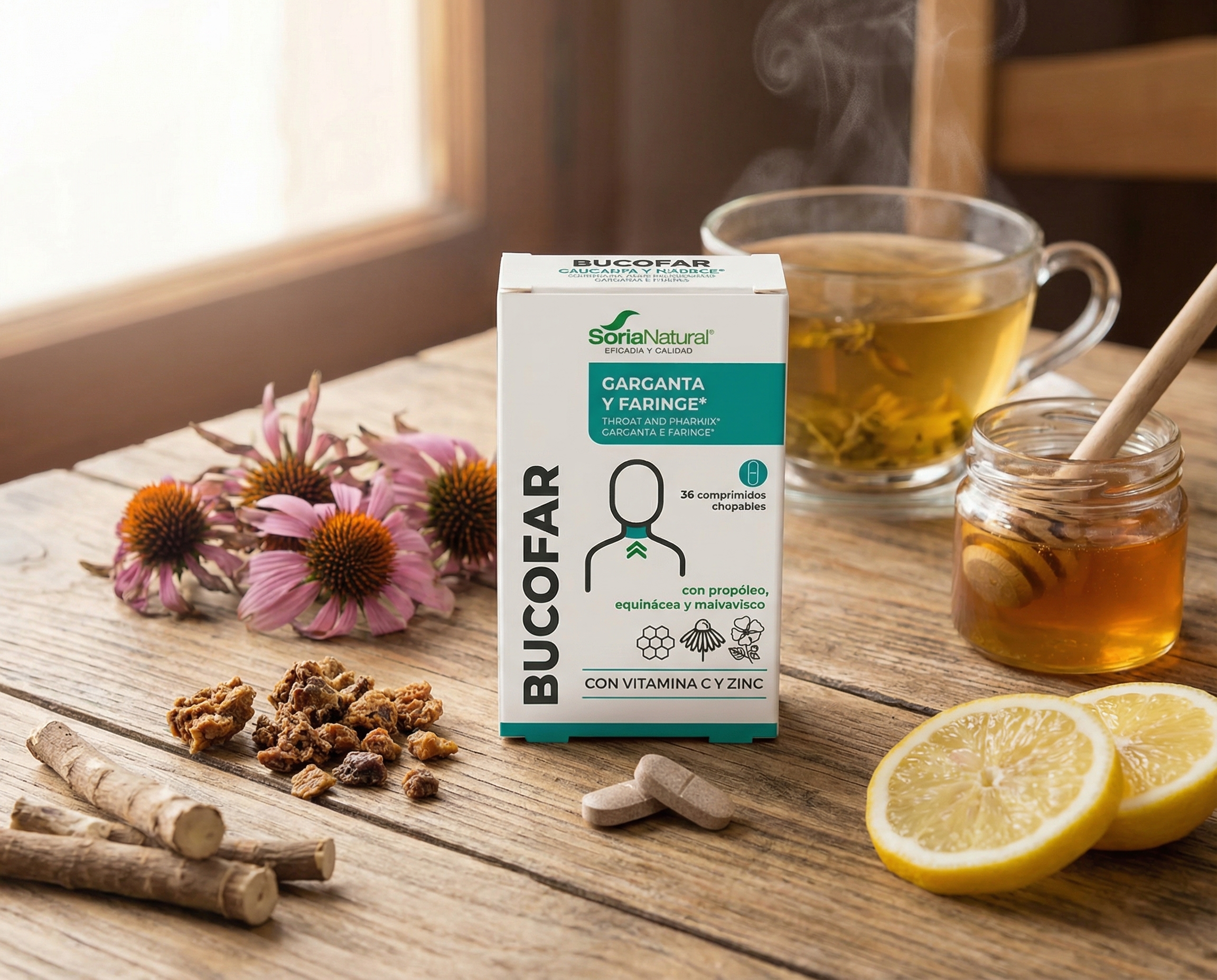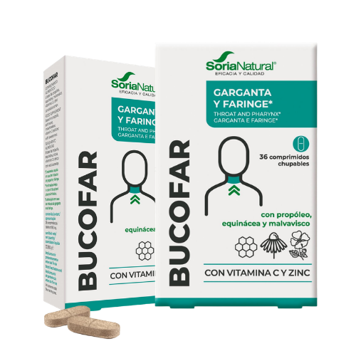 Soria Natural Bucofar 36 comprimidos para chupar es un complemento alimenticio formulado para aportar alivio y protección en la zona de la garganta y la faringe con una combinación de propóleo, equinácea, malvavisco, vitamina C y zinc. La propuesta del producto es clara desde el primer vistazo: ofrecer una opción práctica para quienes buscan un formato cómodo de tomar, fácil de llevar y agradable de usar cuando necesitan cuidar la garganta en su rutina diaria. La marca lo presenta como un producto de “alivio y protección” y destaca de forma específica que el malvavisco ayuda en caso de irritación de garganta y faringe.
